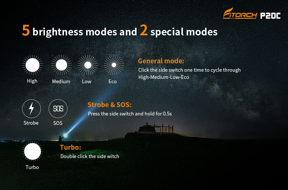 *Modes: Turbo High Medium Low Eco and Strobe & SOS.