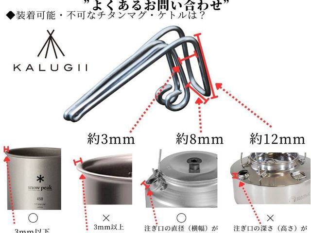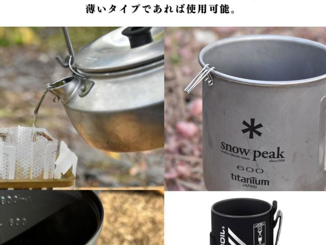 ●様々なメーカーの「ケトル」「チタンマグ」「ソロ用クッカー」に適合するように設計しています。