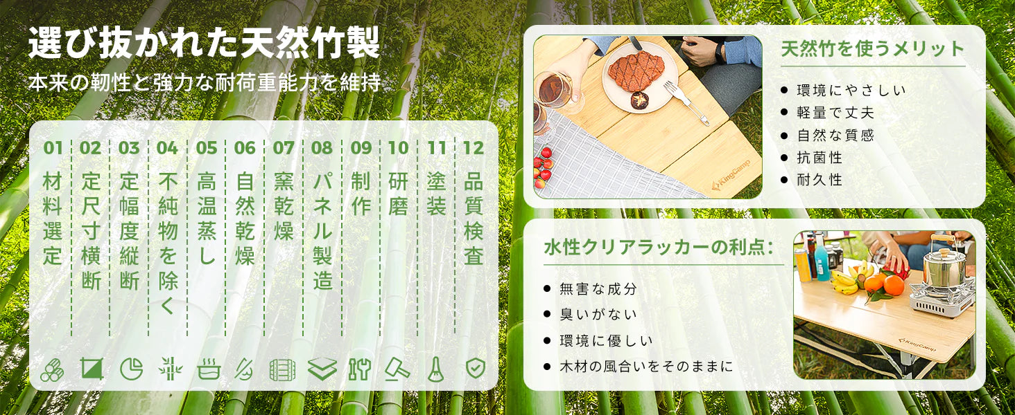 自然の風合いが魅力の竹製天板(厚さ12mm)と、剛性の高いアルミ角パイプフレームを組み合わせた4つ折りテーブル。