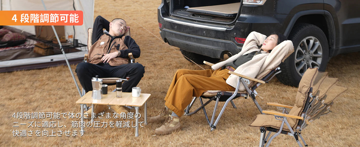 シーンに合わせて4段階に角度を調整可能。リラックス、読書、仮眠など、幅広いスタイルで快適に過ごせます。