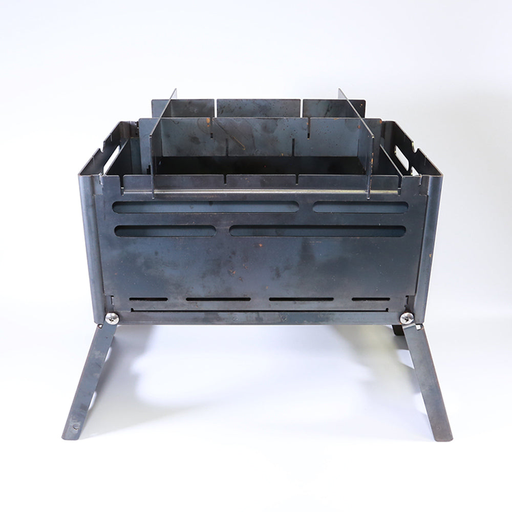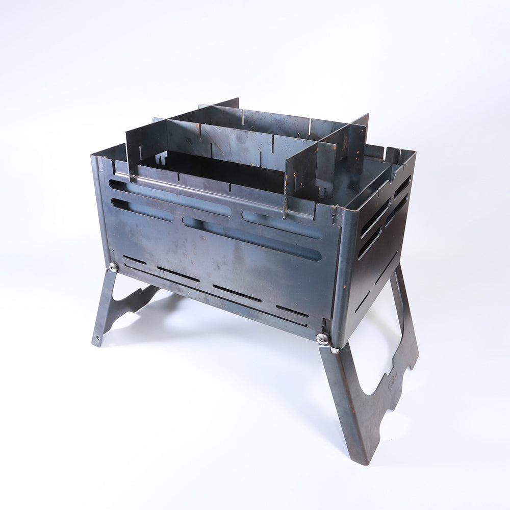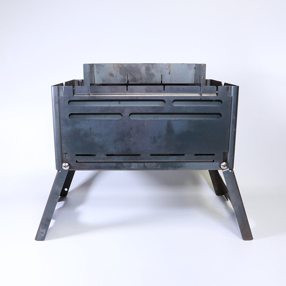 シンプルで無骨なデザインで飽きることなく使える焚火台。煙突のような形状で燃焼効率が良く、高温でしっかり焼くことが出来ます。折りたたんでコンパクトに収納!A4サイズまで小さくまとまります。