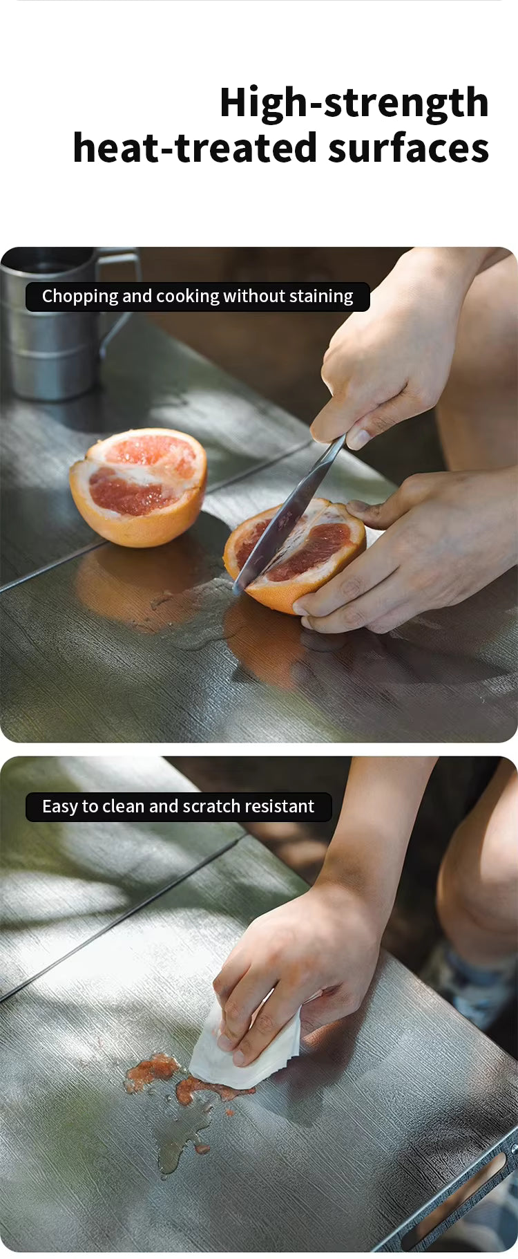 焚き火やBBQで「熱でテーブル天板が傷む」「油汚れが落ちにくい」「水場でも気を遣う」といった悩みを解決するのが、SHINETRIP ステンレス 耐熱 折りたたみキャンプテーブル A451-T00。