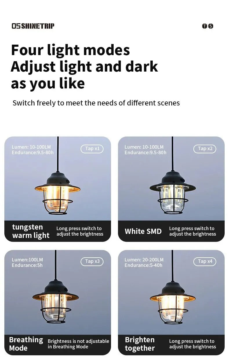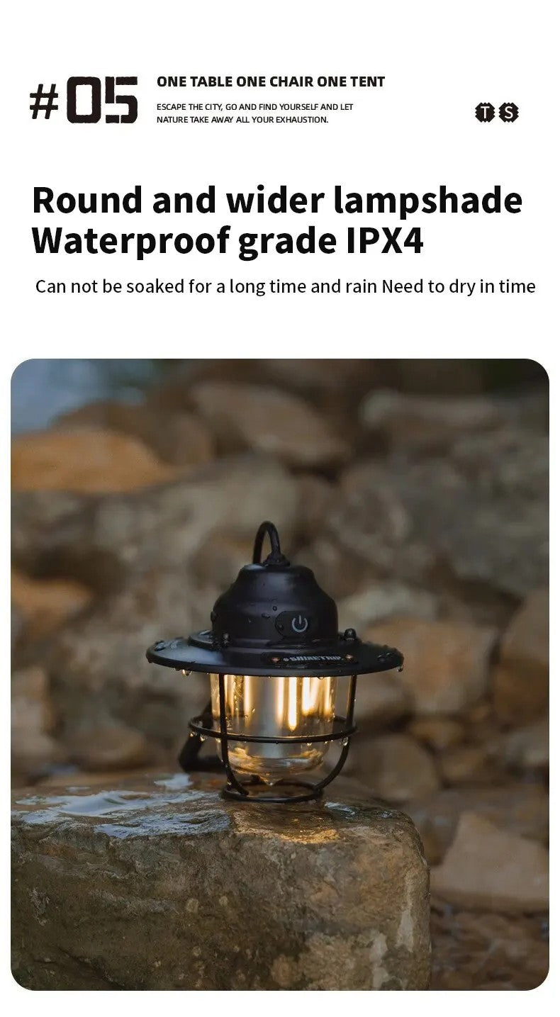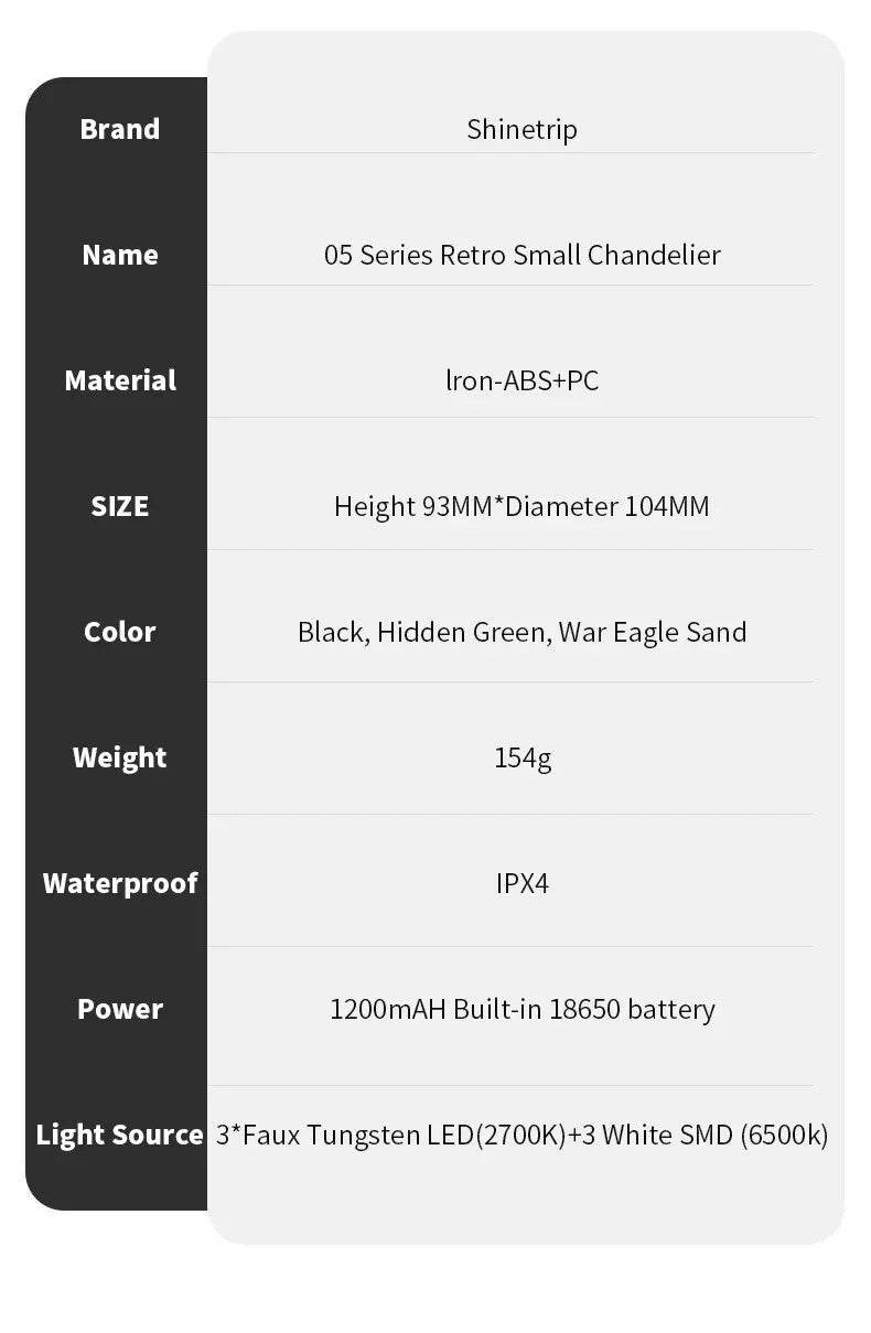 レトロなシャンデリア風デザインの、持ち運べるミニアンビエントライト。テント内やタープ下で吊るすだけで雰囲気が一気に上がり、サイトの“仕上げ”に最適です。軽量コンパクトで荷物になりにくく、暖かい光と白色光を切り替えて使えるので、くつろぎ時間から手元照明まで幅広く活躍します。ブラック/グリーン/サンドの3色展開。