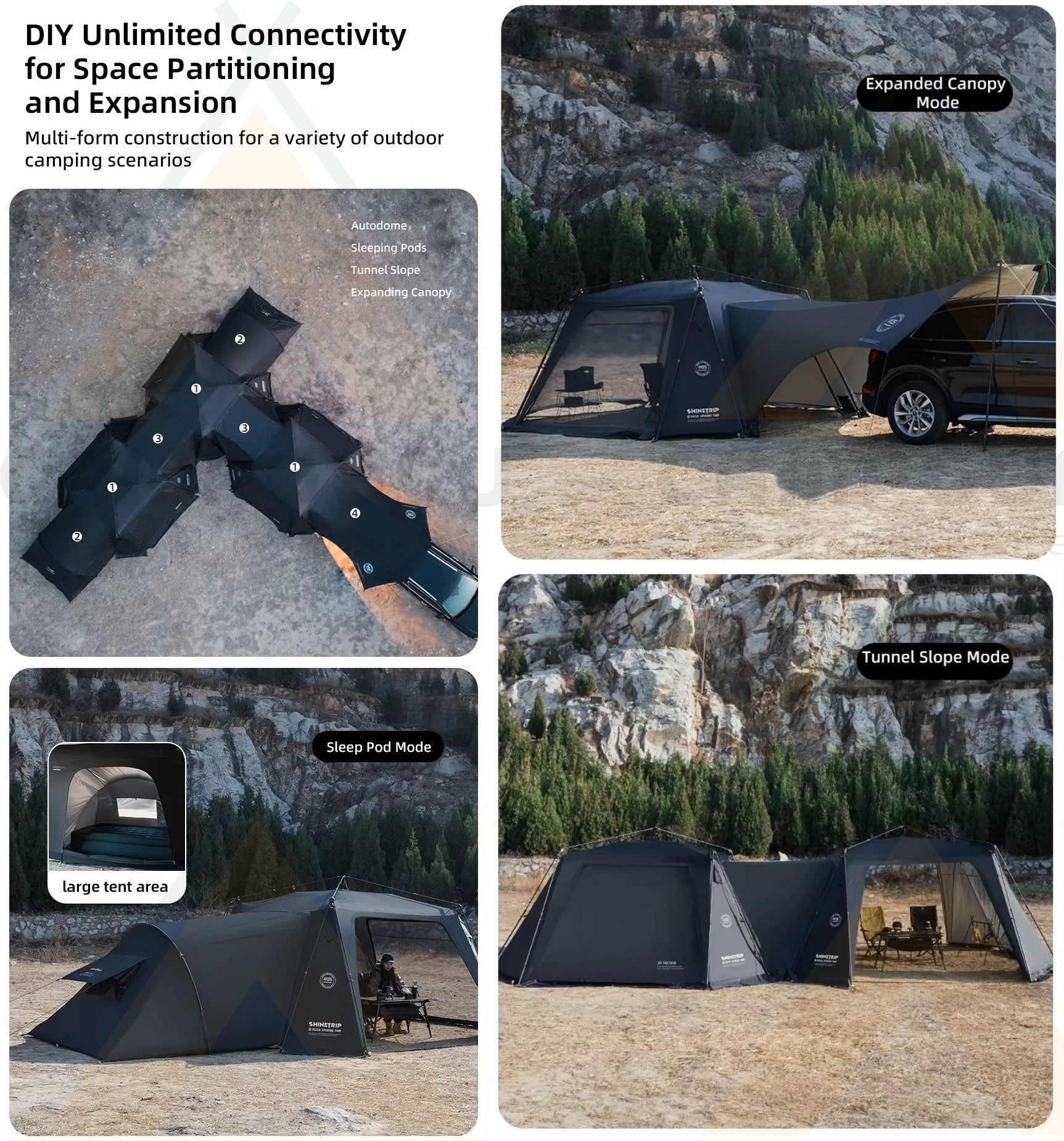 専用オプションのサイドウォール・メッシュ・トンネル・スリーピングポッド・拡張キャノピーなど、多彩な拡張パーツで快適空間を自由にカスタマイズ。