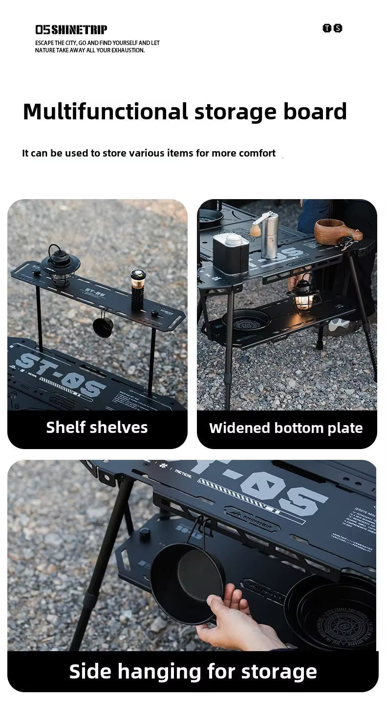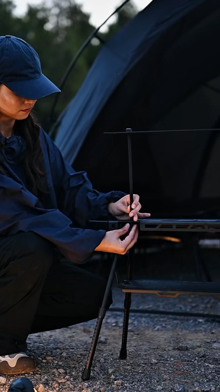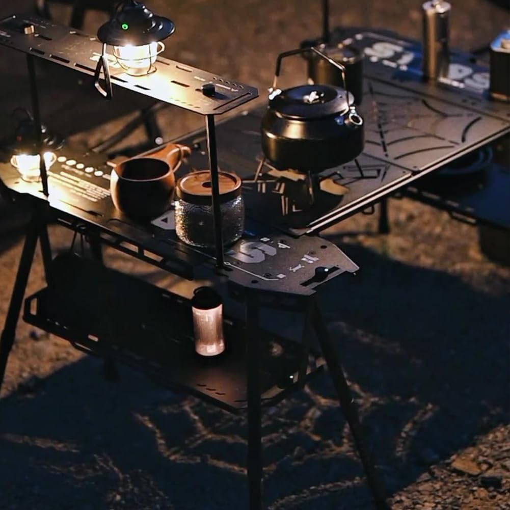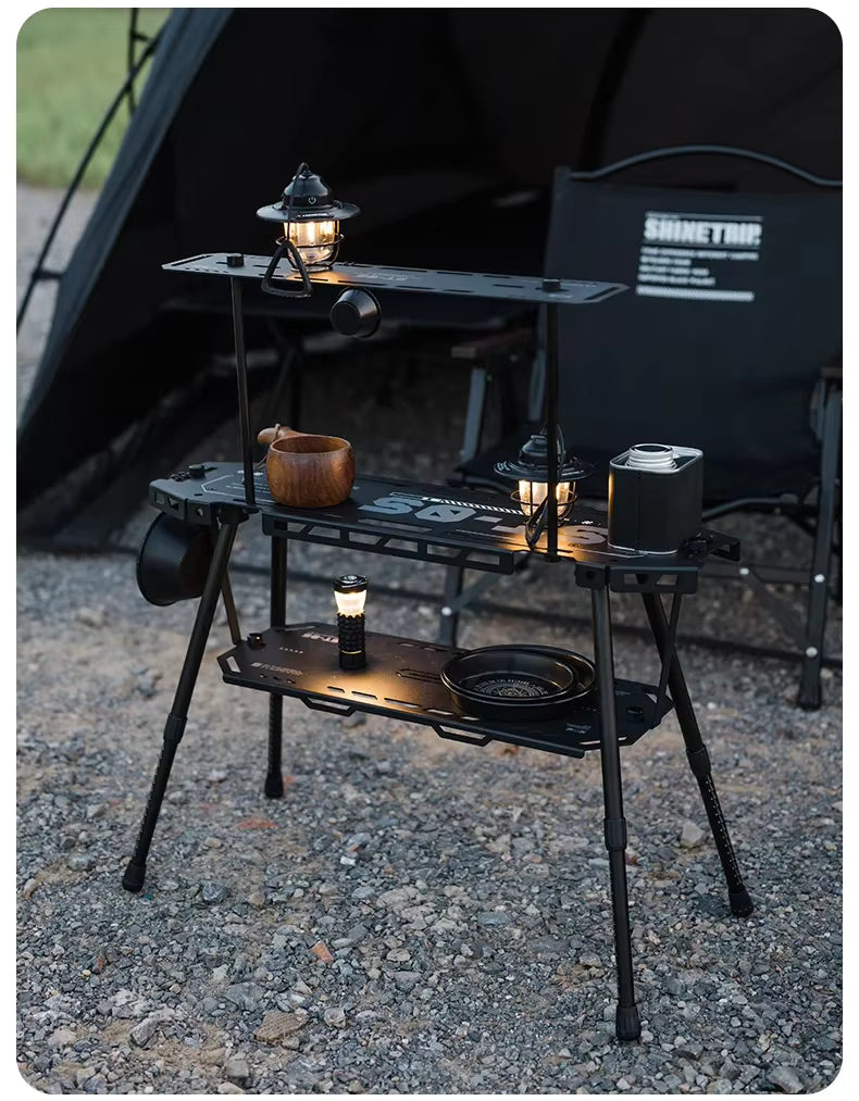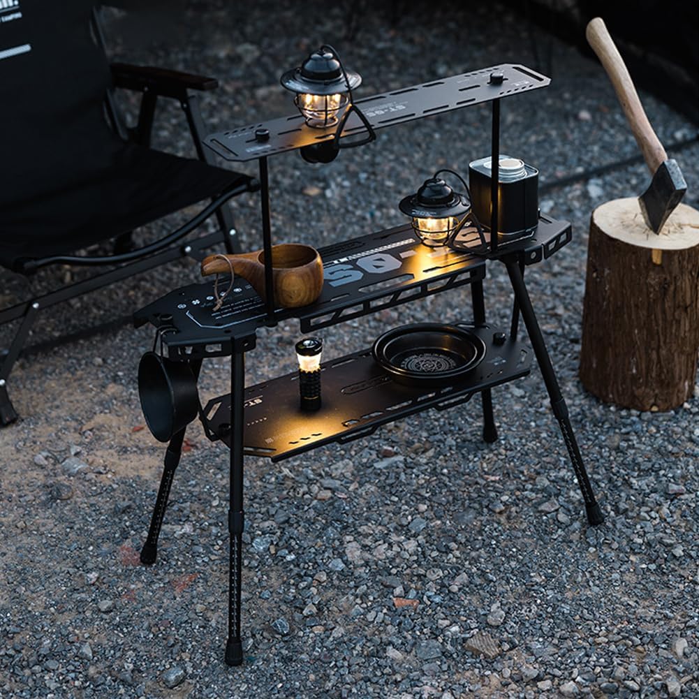 上段ラック・メイン天板・下段棚を組み合わせることで、調理道具・ランタン・小物を“縦に整理”でき、テーブル上の混雑を一気に解消します。