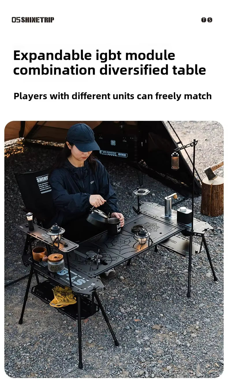 さらにIGTフレーム(S/M/L)でレイアウトを拡張できるため、ソロ〜グループまでサイト構成に合わせて自由に組めるモジュールテーブルです。