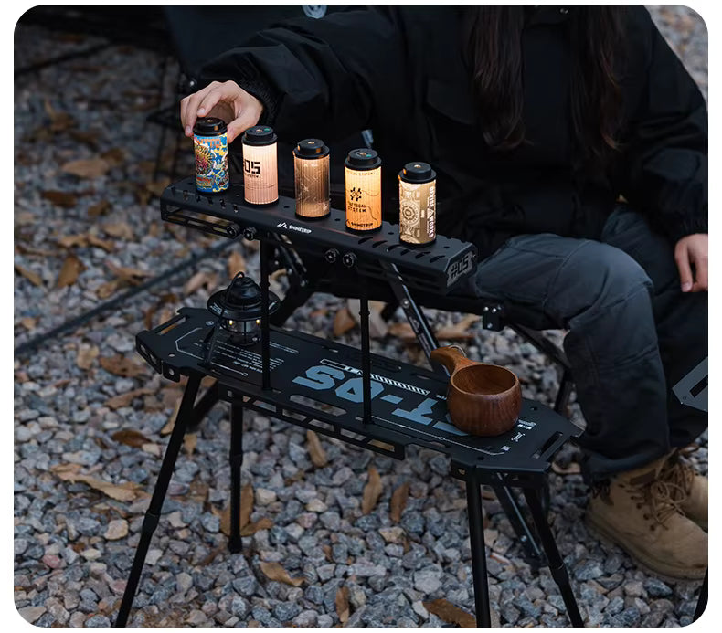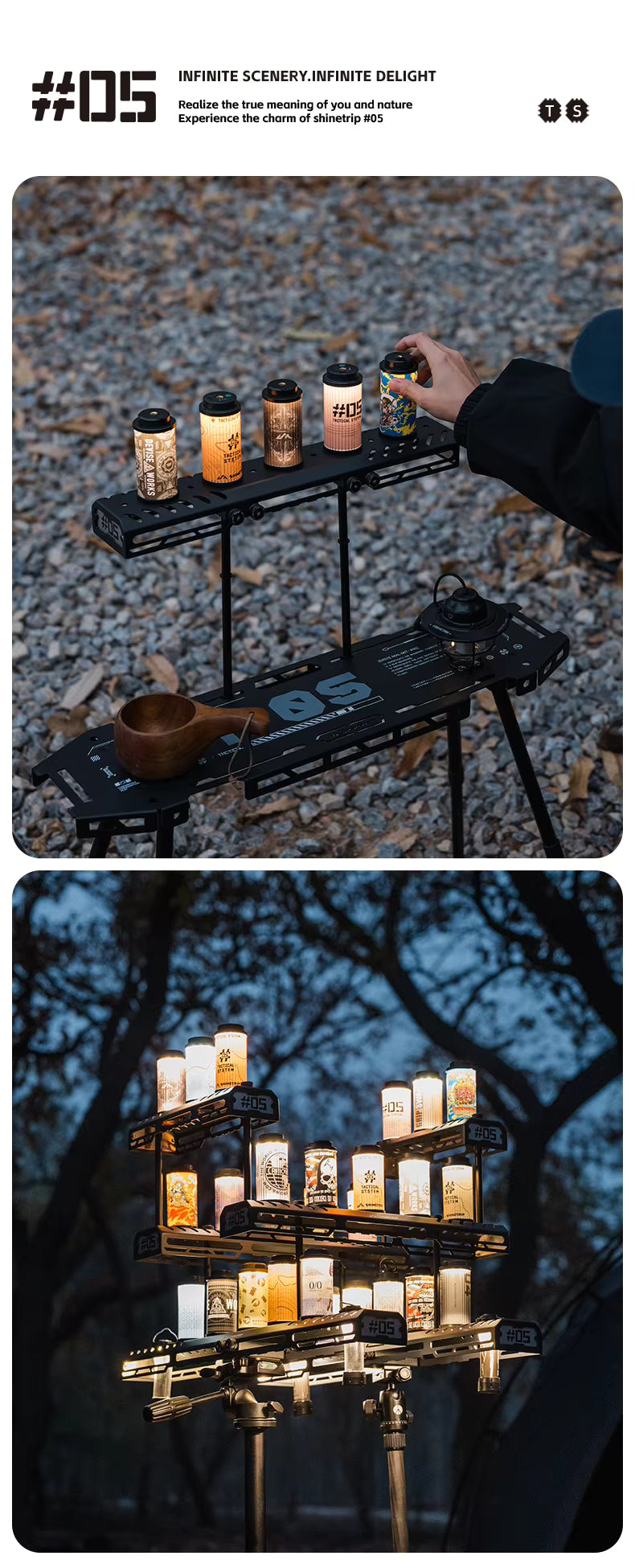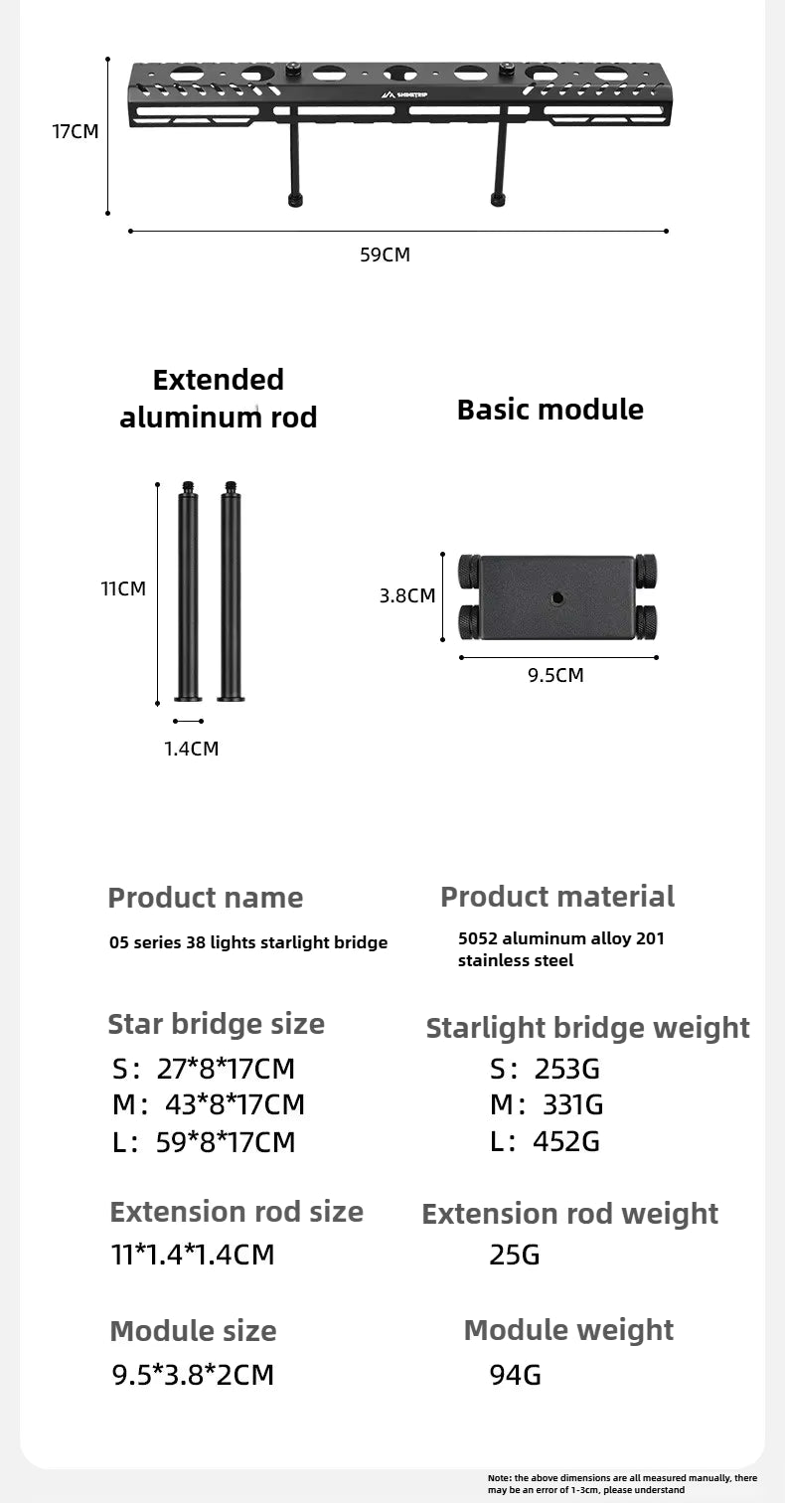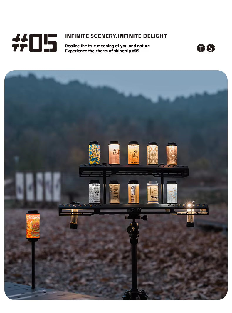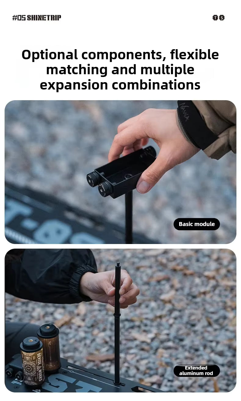 山趣(ShineTrip)ST-05シリーズの「38灯 スターライトブリッジ」関連パーツ。38灯(38-kT)を美しく並べて固定・ディスプレイできるブリッジ本体(S/M/L)に加え、拡張用のベーシックモジュールと延長アルミロッドを用意。サイトの雰囲気作りや撮影、テーブル周りのレイアウトに合わせて長さ・構成を選べます。