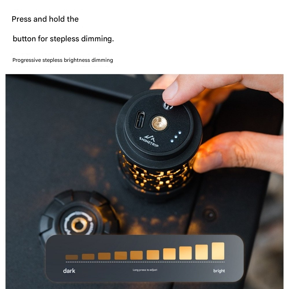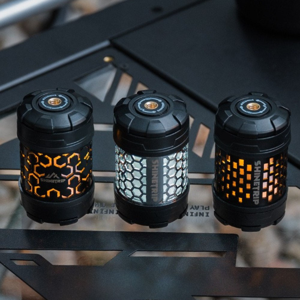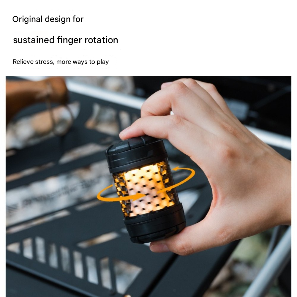 回転ギミックを備えたコンパクトライトユニット。指先で回して楽しめるデザインで、キャンプサイトの雰囲気作りやテーブル周りのアクセントに最適です。底面マグネットで金属面に固定でき、1/4インチネジ穴によりスタンドや各種アタッチメントへの拡張も可能。暖色/寒色のデュアル光源、4段階調光+長押し無段階調光に対応し、シーンに合わせた光量調整ができます。Type-C充電、1000mAh(18350)バッテリー内蔵。