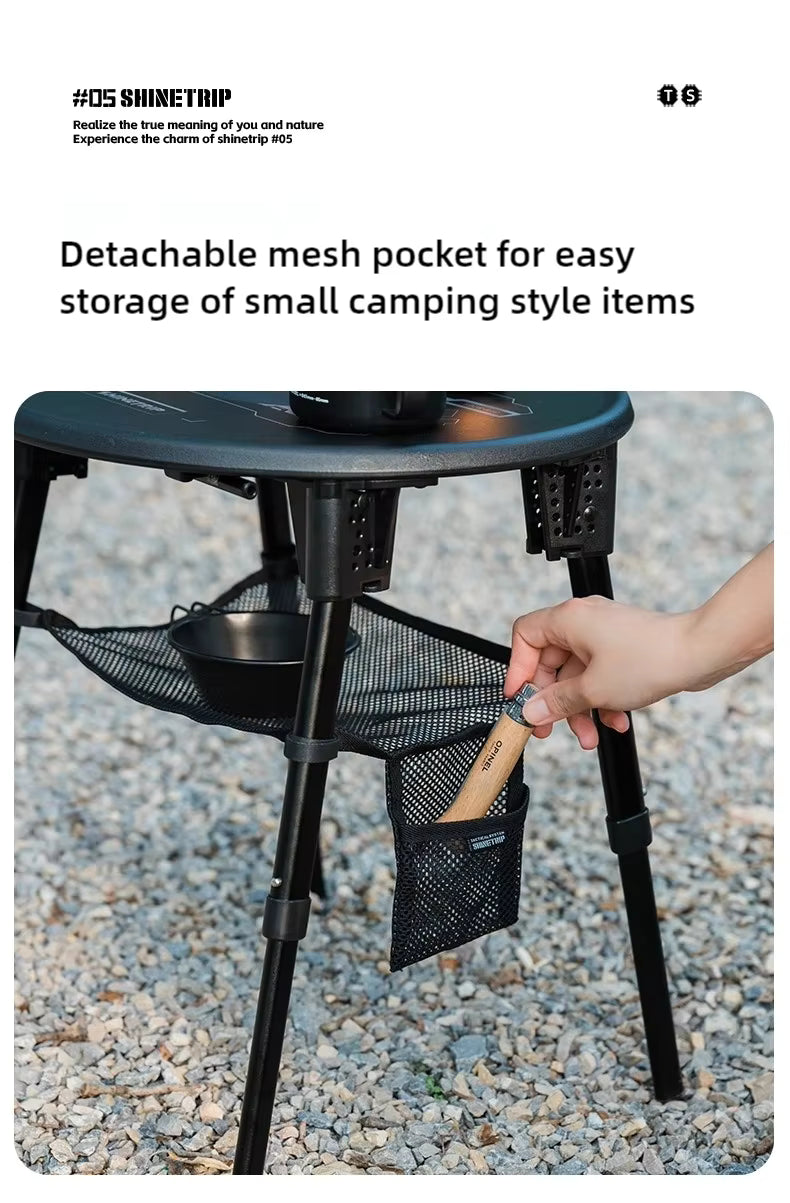キャンプサイトで「高さが合わない」「用途に合わせてテーブルを変えたい」「ランタンとテーブルを1台で完結したい」といった悩みを解決するのが、SHINETRIP #05 Series Tactical Lifting Dual-use Round Table。