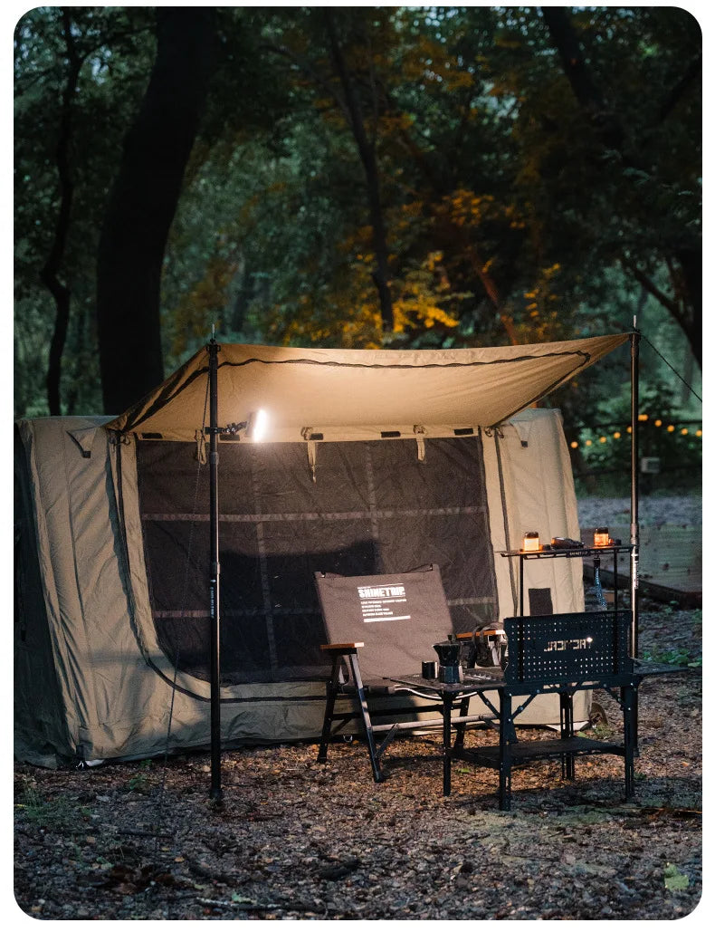 自然の中で過ごす時間を、もっと快適に、美しく。 山趣は、テント、シェルター、テーブル&チェア、キッチンシステム、照明、収納など、 キャンプシーンをトータルで支えるモジュラー構造のギアを展開。 洗練されたデザインと高い機能性を両立し、 アウトドアの自由をスタイリッシュで心地よい体験へと導きます。