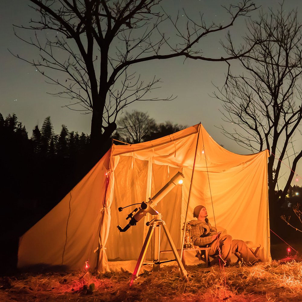 アメリカ大陸の開拓時代から続く「たき火」コンセプトです。歴史あるキャンプファイヤーテントを、Bush Craft Inc.が改良し復刻しました。
