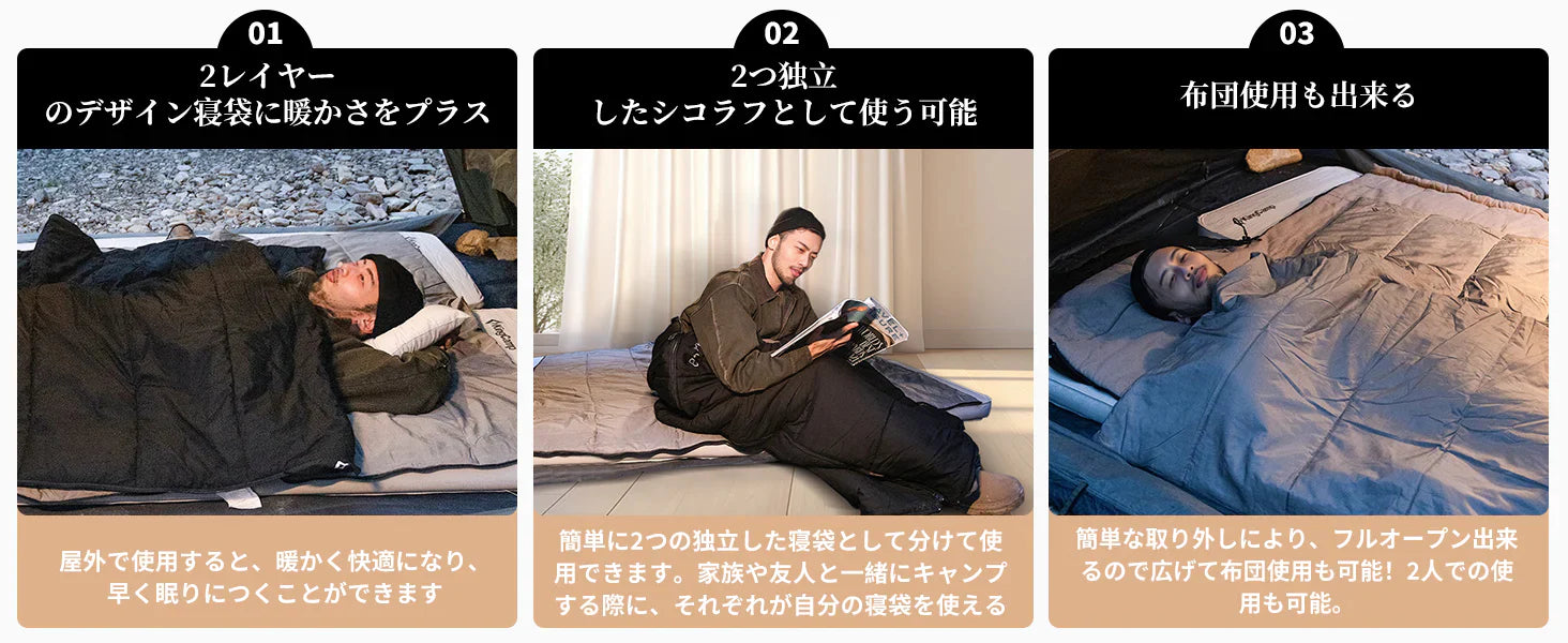 ブランケット単体、寝袋単体、組み合わせて保温性アップと3通りの使い方が可能です。