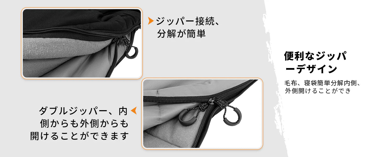 ダブルジッパー設計:温度調整が簡単、布団としても展開可能