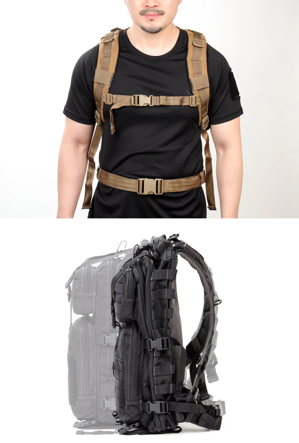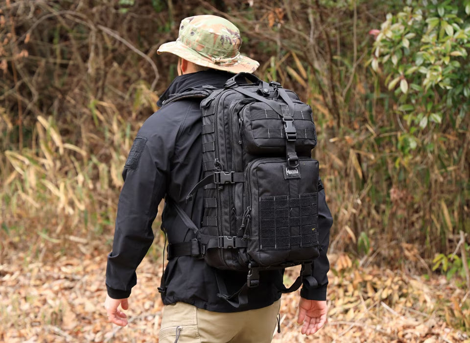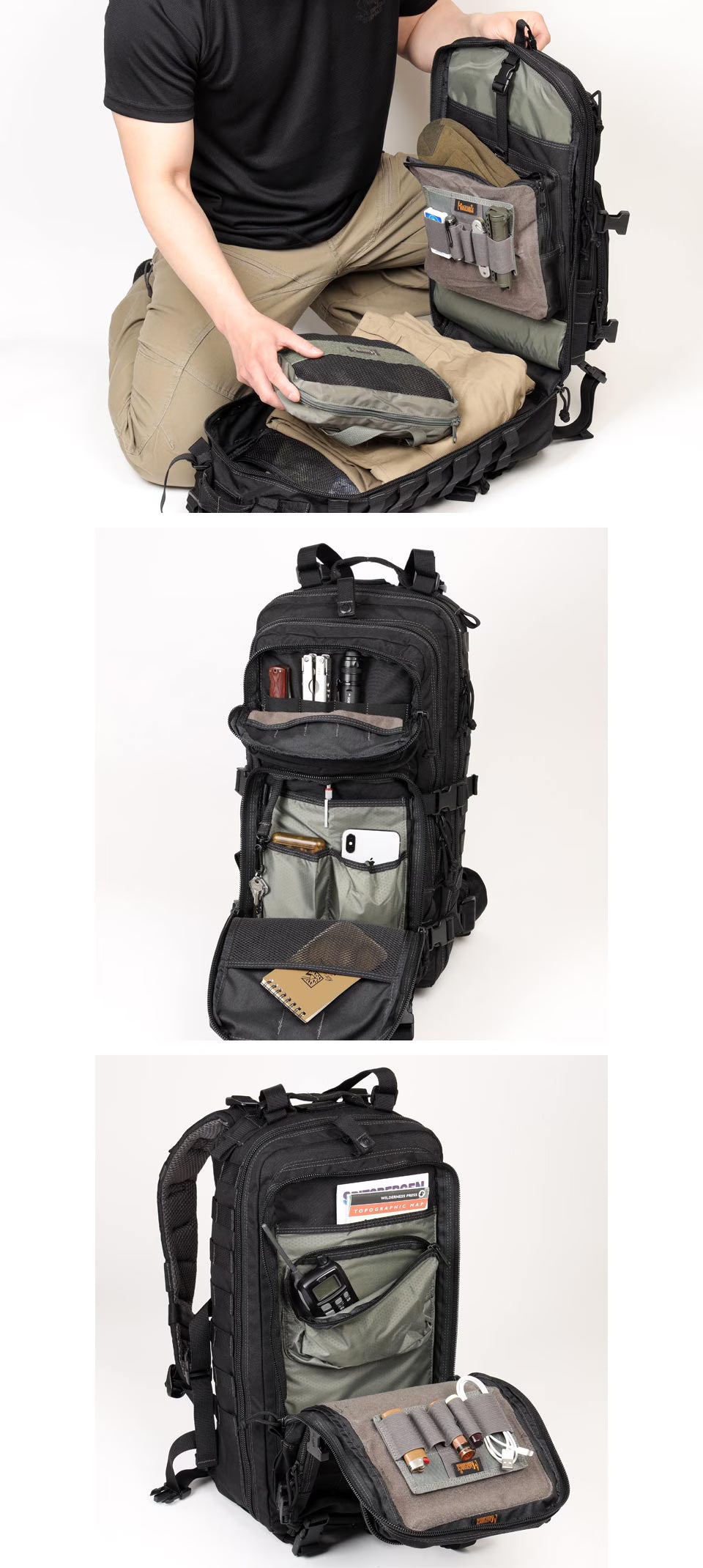 三層式コンパートメント構造により効率的なパッキングが可能で、外面のウェビングやレーザーカットパネルを活用すれば、MOLLE対応モジュールやツールを自在に追加可能。細身のシルエット設計により、茂みや人混みでも引っかかりにくく、キャンプやブッシュクラフトなど本格的なアウトドアシーンに対応する高機能バックパックです。