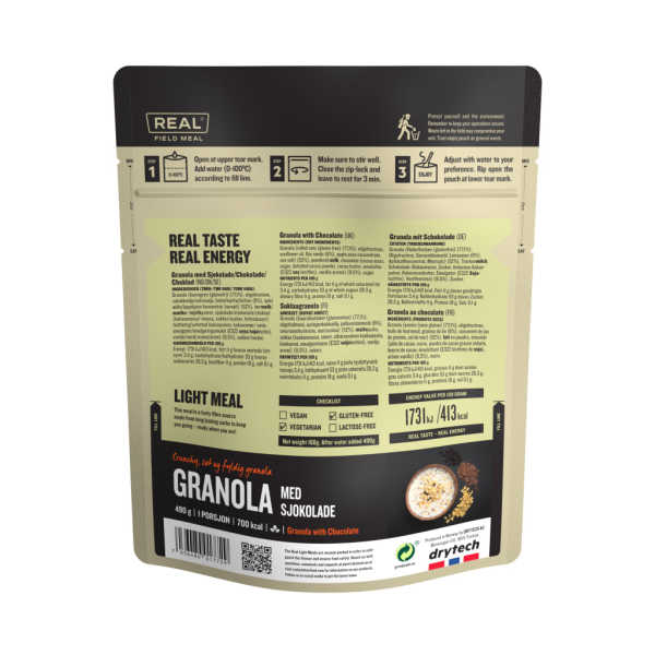 ノルウェーのフリーズドライ食品ブランドReal Field Mealのチョコレートグラノーラは、アウトドアや長時間行動時のエネルギー補給に適した高カロリー朝食です。