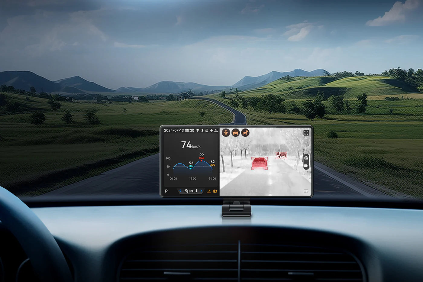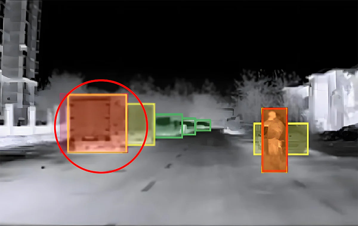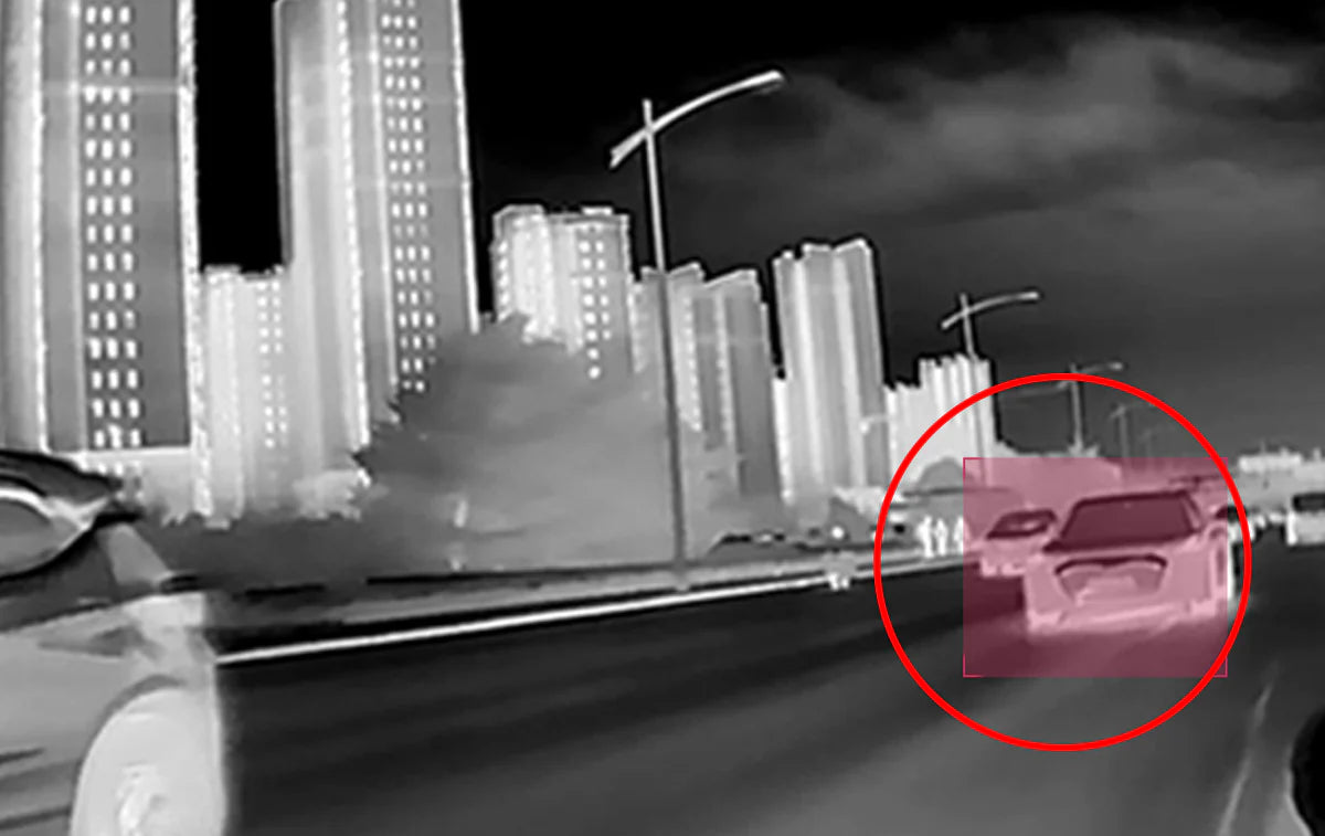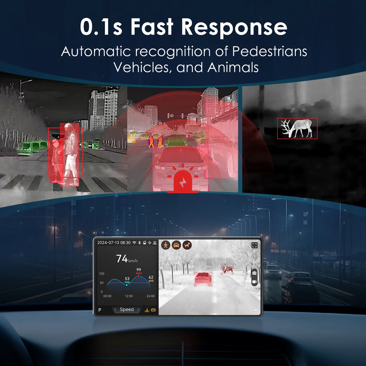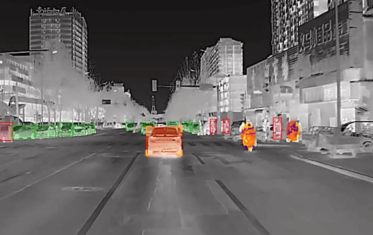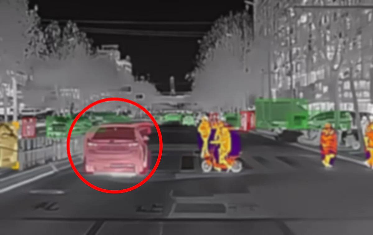 高感度サーマルセンサーとRazor Xアルゴリズムにより、暗闇・霧・煙の中でも300m先まで的確に人や車、動物を検出し、音と映像の両方で警告します。:contentReference[oaicite:1]{index=1}