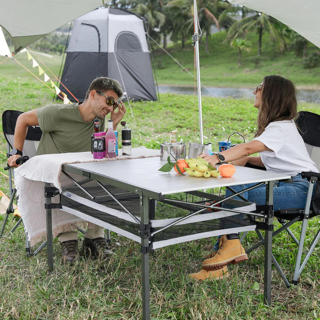 アルミ製の天板は耐熱性と耐磨耗性に優れ、加熱した鍋やケトルも直接置けます。アウトドア調理に最適なテーブル構造です。