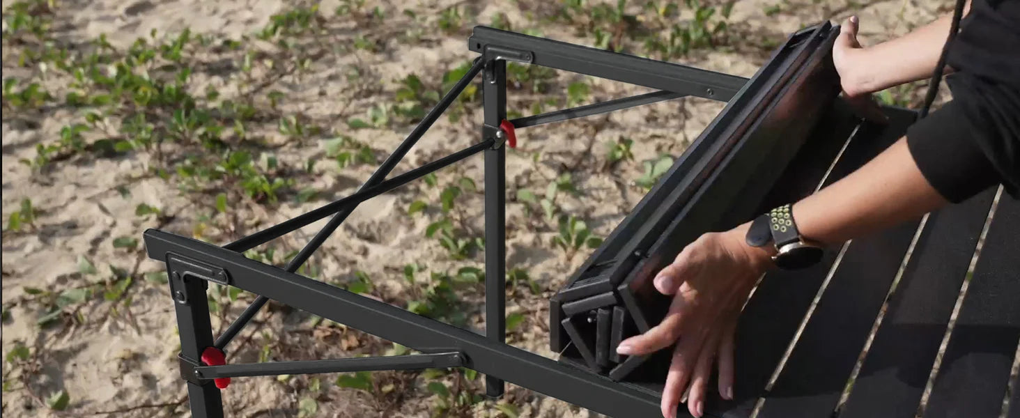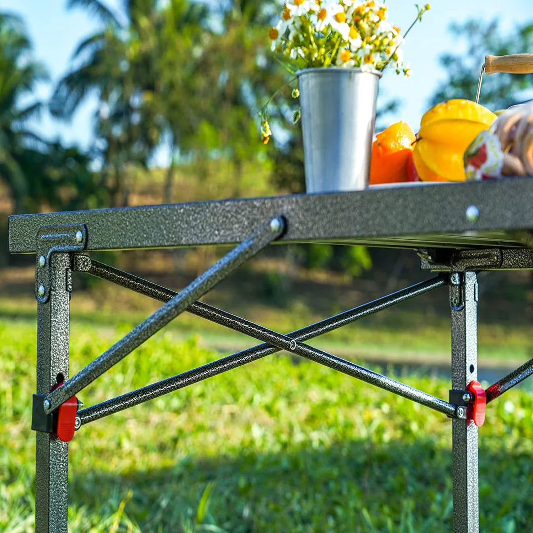 フレームは頑丈なスチール製、天板には軽量で錆びにくい6061アルミニウム合金を採用。