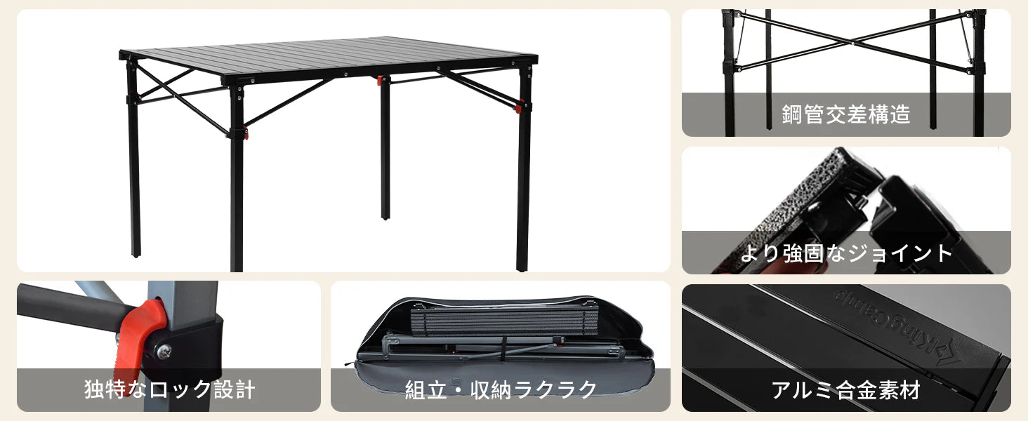 【KingCamp|キングキャンプ】アウトドアロールテーブル アルミキャンプテーブル 107×70×70cm(シルバー/ブラック)